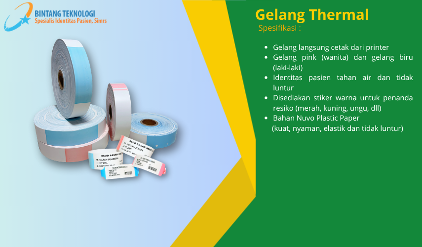 6 poin atau enam langkah untuk meningkatkan keselamatan pasien berdasarkan International Patient Safety Goal (IPSG), antara lain adalah Identitas Pasien dan salah satu cara mengidentifikasi pasien tersebut yaitu dengan Gelang Pasien. Tepat sekali anda berada disini karena kami adalah Perusahaan yang memproduksi Identitas Pasien berkualitas, salah satunya adalah Gelang Pasien yang telah memenuhi standar ketepatan Identifikasi Pasien, Tulisan tidak luntur, Jelas terbaca, dan Tahan Air. Di cetak dengan Printer khusus yang terhubung dengan sistem komputer Rumah Sakit. Gelang kami terbuat dari bahan yang kuat, tidak menimbulkan iritasi, tidak dapat disobek,lentur dan nyaman.