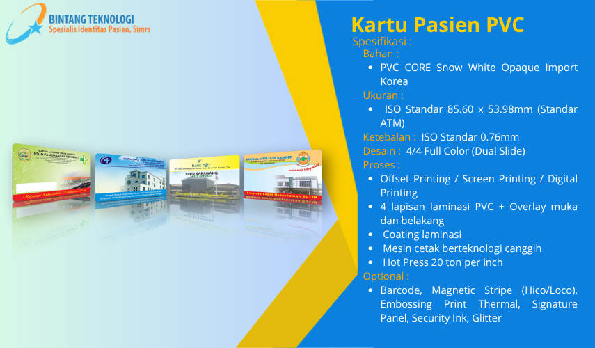 Kartu Pasien adalah bagian tidak terpisahkan dari Identitas Pasien, kegunaan Kartu Pasien bagi pasien adalah sebagai bukti bahwa pasien tersebut telah terdaftar dan tercatat sebagai pasien Rumah Sakit dan harus dibawa setiap kali berobat, dan kegunaan bagi Rumah Sakit, Puskesmas, Klinik ataupun Instansi yang sama adalah mempermudah dan mempercepat pelayanan kesehatan, sebagai data dalam manajemen rumah sakit agar mudah dalam pencarian data dan riwayat pasien. DENGAN PENGALAMAN DAN DI DUKUNG TEKHNOLOGI CETAK CANGGIH KAMI BANTU ANDA UNTUK MENCETAK KARTU PASIEN SESUAI STANDAR INTERNASIONAL.