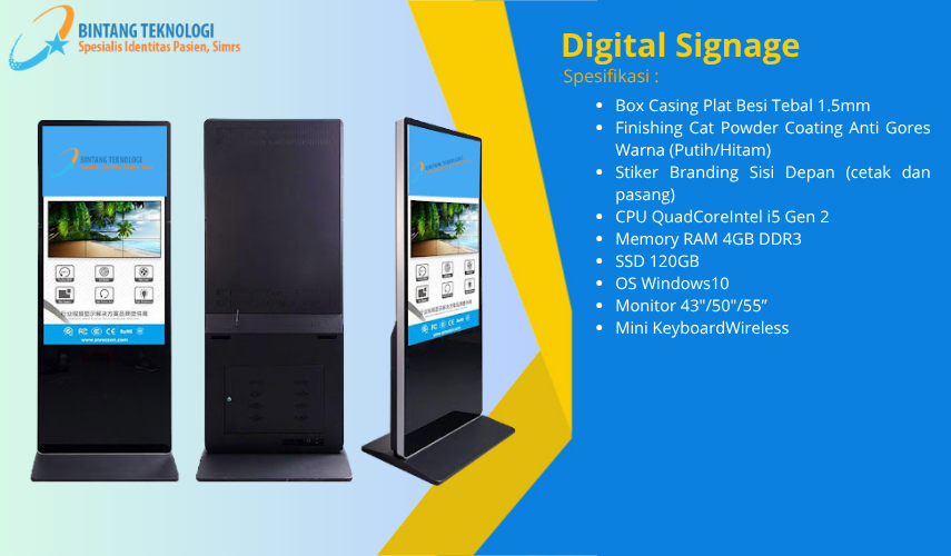 Digital signage adalah teknologi canggih yang menyimpan dan memproses data untuk menampilkan berbagai informasi bagi siapa saja yang melihatnya. Digital signage sering kali terlihat di tempat umum seperti bandara, stasiun, terminal, rumah sakit, mall, dan banyak lagi. Selain itu, bentuk dari digital signage juga hampir menyerupai TV yang mempermudah orang untuk membaca informasi yang ditampilkan.